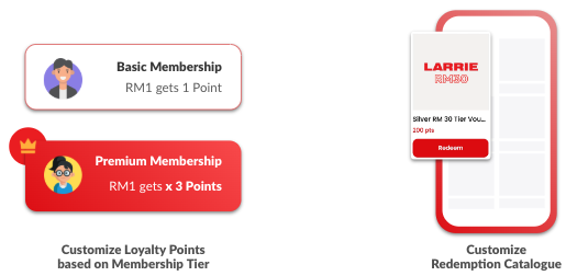 Lowest form of loyalty retention. Accumulate points and redeem cash vouchers, free gift, or discounts from your very own customized redemption catalogue